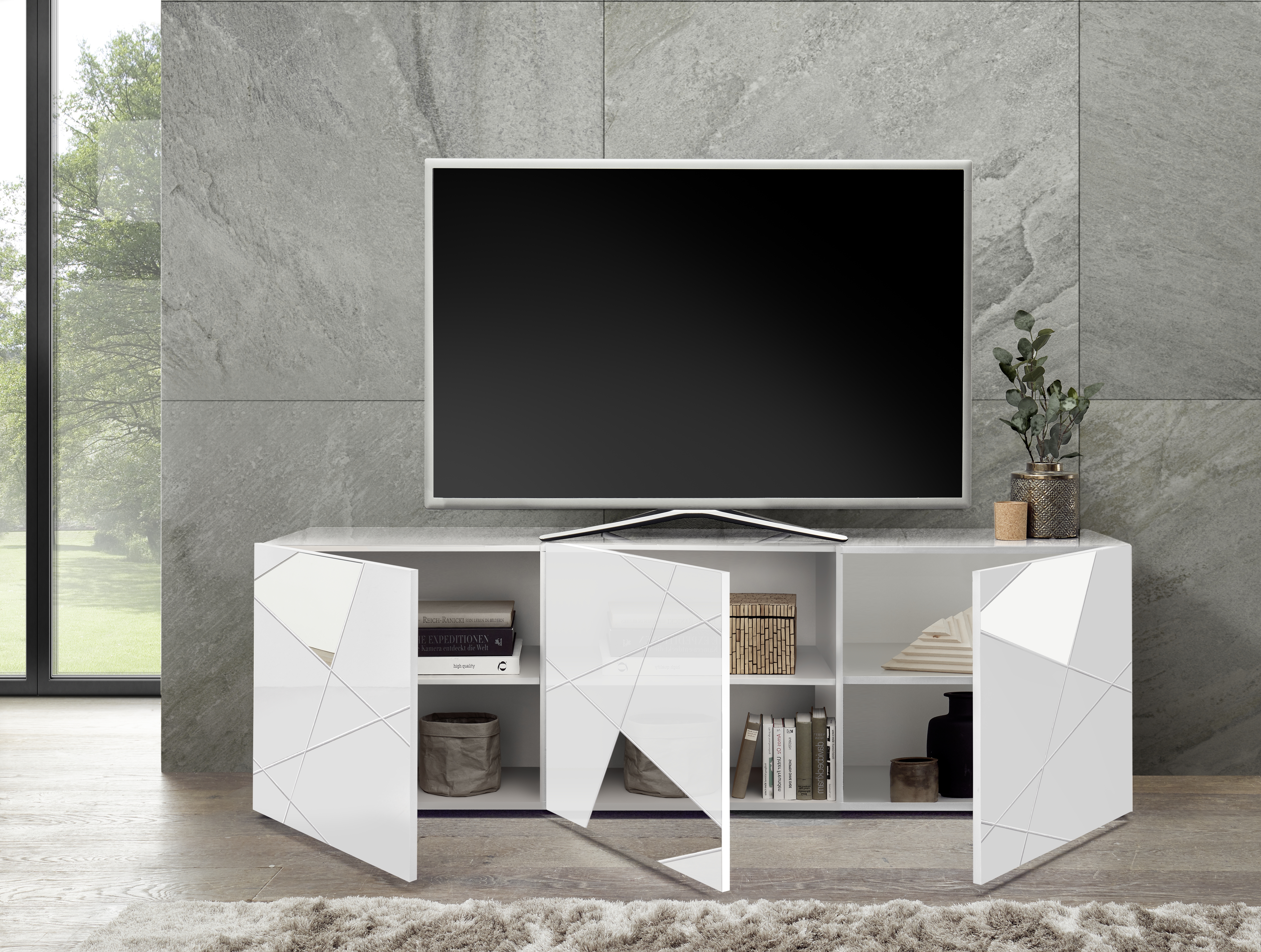 | Finition | Blanc brillant avec sérigraphies et miroirs |